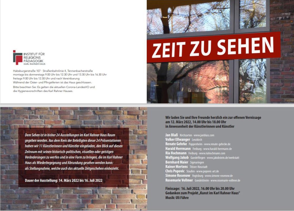 ZEIT ZU SEHEN 3/2022 Verfasst vonfabiotoni218. März 20228. März 2022Veröffentlicht inAllgemein Ria Hochmann: Memory 2022 Teilen mit: Auf X teilen (Wird in neuem Fenster geöffnet) X Auf Facebook teilen (Wird in neuem Fenster geöffnet) Facebook Gefällt mir Wird geladen … Ähnliche Beiträge Veröffentlicht von fabiotoni21 geb. 1960 in Freiburg/ Breisgau Bildende Künstlerin 2009 Mitglied der GEDOK Freiburg 2016 Mitglied im BBK Freiburg Mehr Beiträge anzeigen